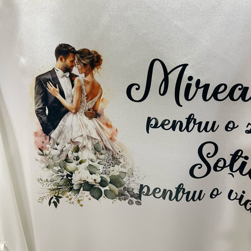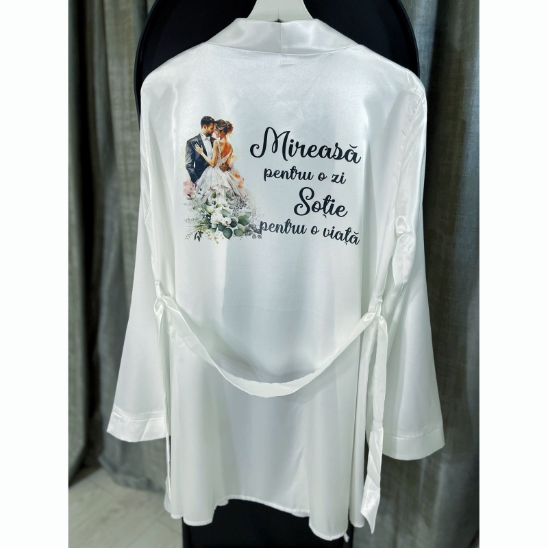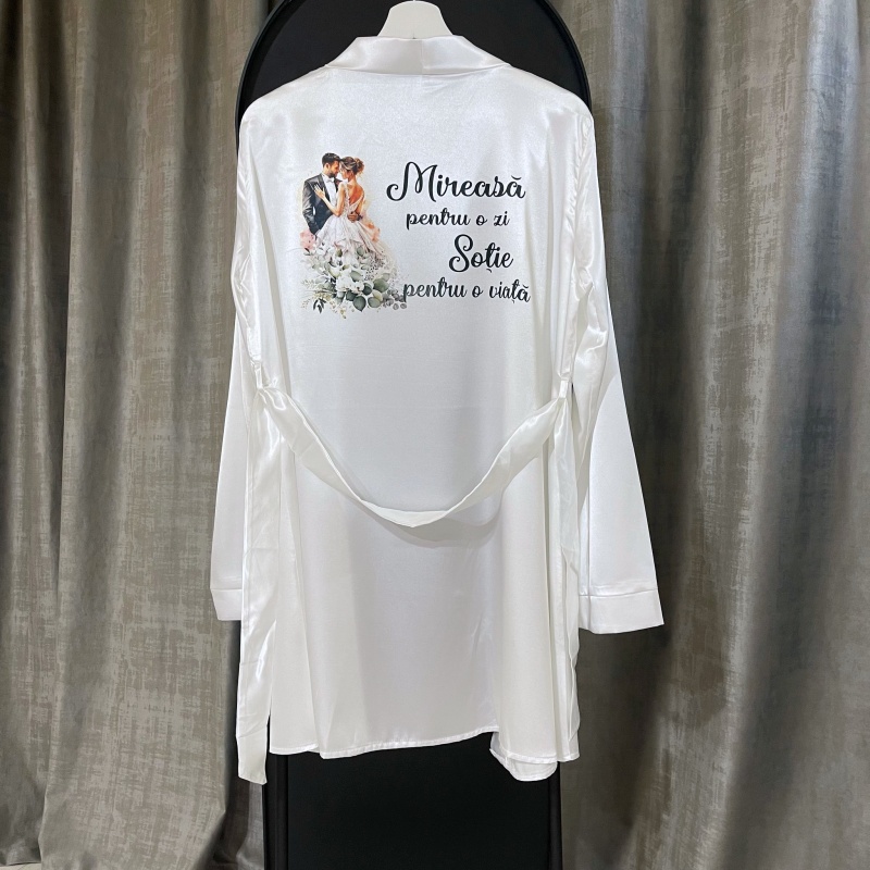 Halat Mireasa din material satinat cu imprimeu pe spate.