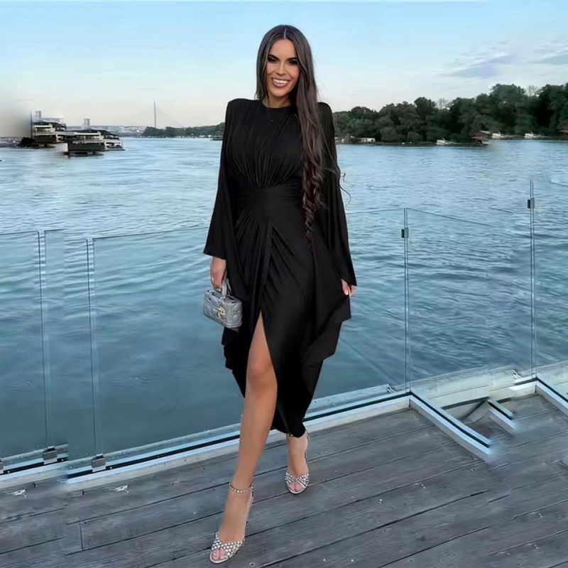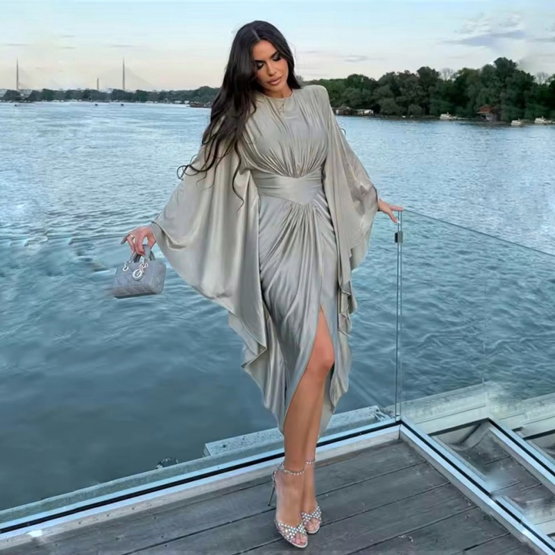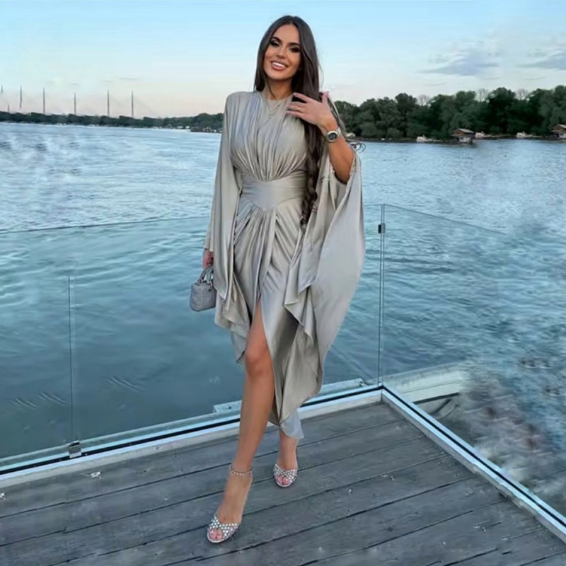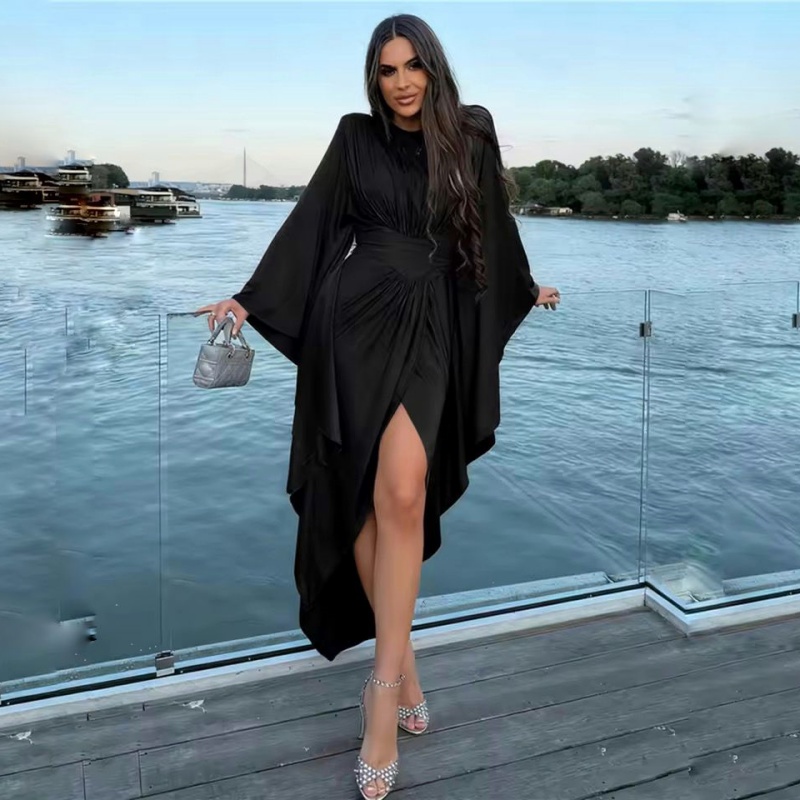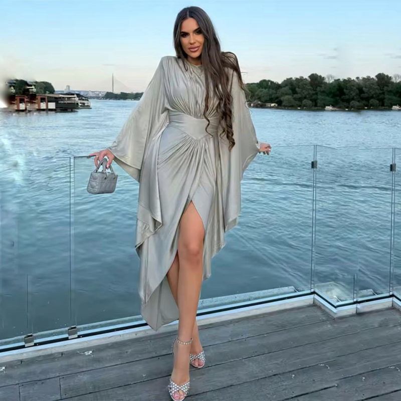 Rochie midi elegantă din mătase sintetică, cu drapaje frontale și mâneci ample tip cape. Talia evidențiată și croiala petrecută cu deschidere pe picior conturează o siluetă rafinată, ideală pentru evenimente speciale.